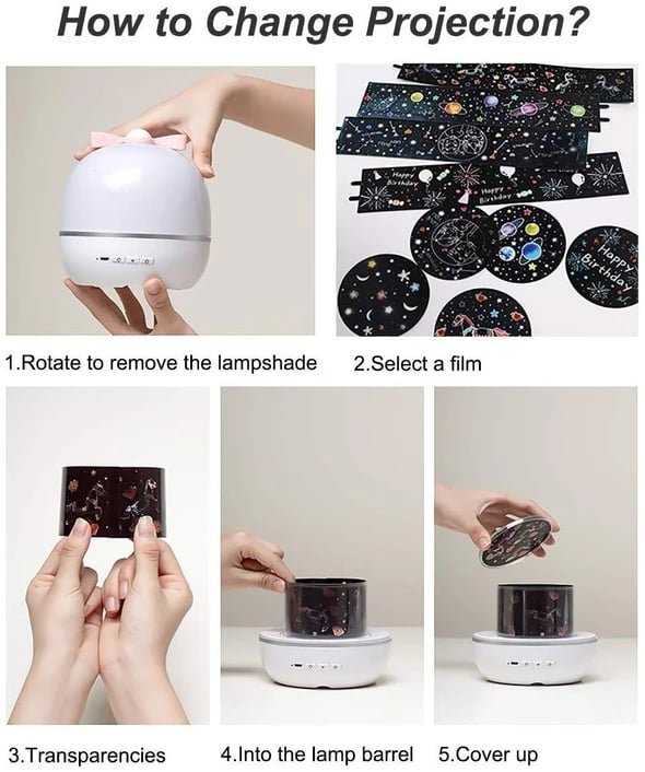 6 Different Films,switch lighting effects at will:The starry night light projects Magical Universe,Ocean Undersea ,Rotating Trojan,Happy Birthday and Rose Garden,Lucky Deer around a room, thereby transforming the room into a relaxing environment at night. It gives your kids and wife comfort and a feeling of relaxation at night while allowing you to enjoy a romantic moment with your partner.